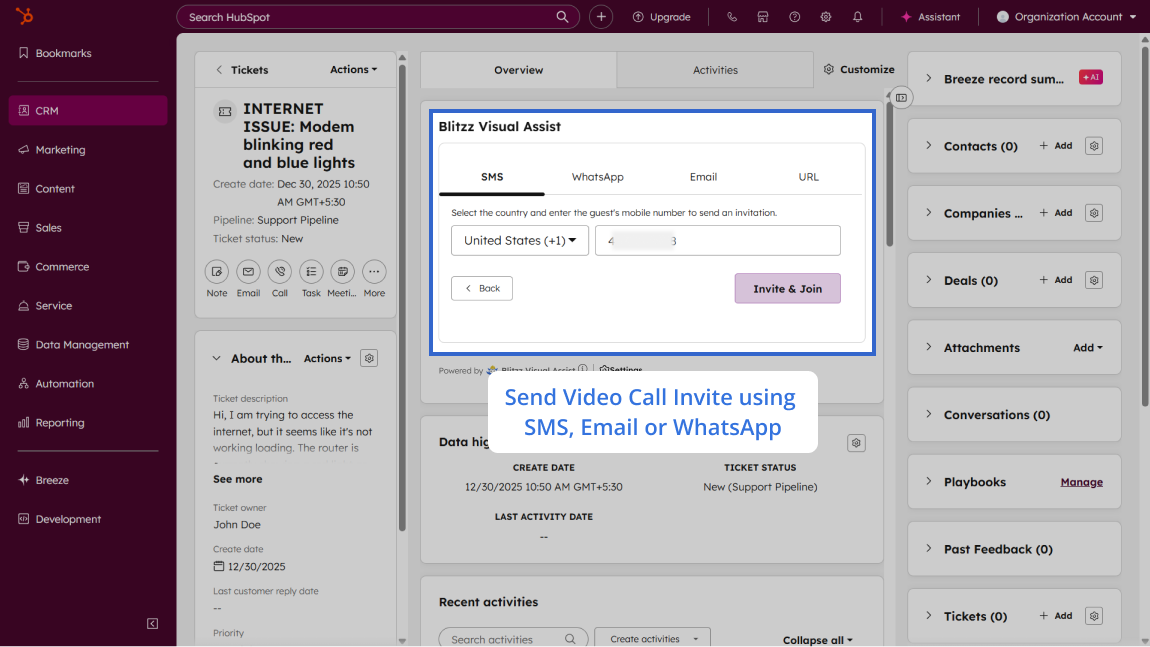 Blitzz provides a native integration that embeds directly into the HubSpot agent interface. Agents can launch video sessions from tickets, conversations, or any customer interaction. The integration supports seamless escalation from chat or email to video without disrupting the customer experience.