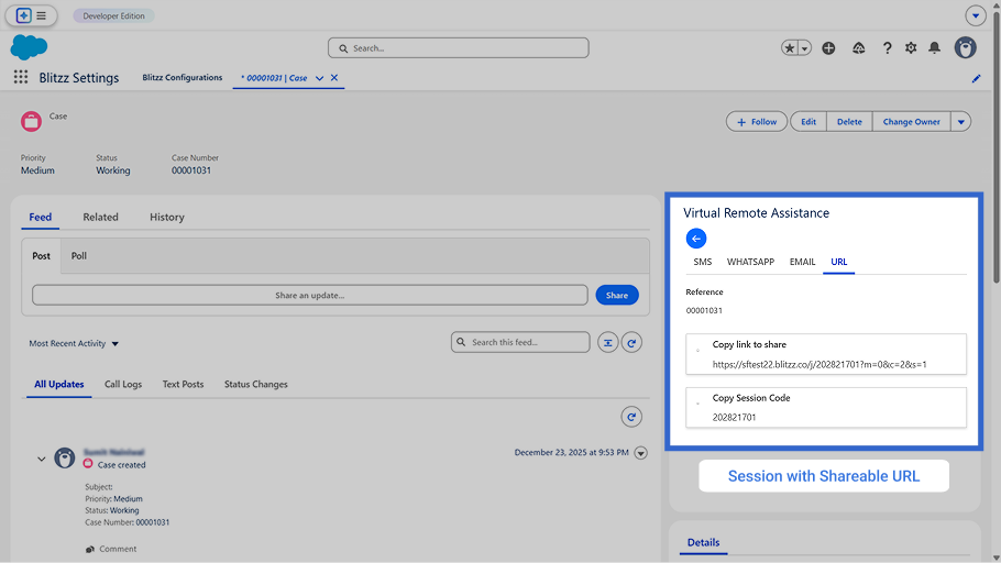 Blitzz integrates with Salesforce Service Cloud, Sales Cloud, and Field Service Lightning. The integration works with both Salesforce Classic and Lightning Experience interfaces. You can launch sessions from Contacts, Cases, Accounts, Work Orders, and custom objects.